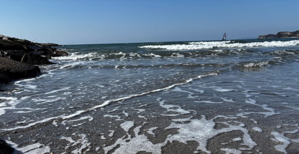 気が早い人はもう海入ってますが、風足りない感じです。波もないし・・。