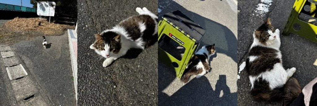 首輪ついてないのでノラだと思いますが可愛い顔してます。クルマに乗り込んで来たらたぶん連れ帰っちゃう(笑。片耳切れてるから去勢済みかな。この辺猫多くて餌場もあったりするので、保護活動してる人でもいるんでしょうかね。