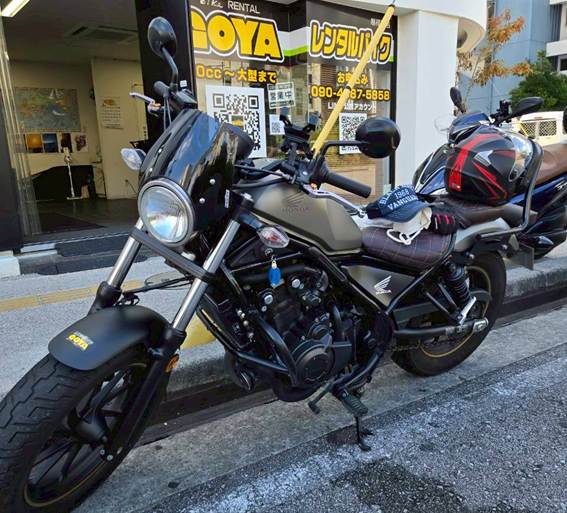 GOYA旭橋店でレブル500とジェットヘルを借りて出発です。
